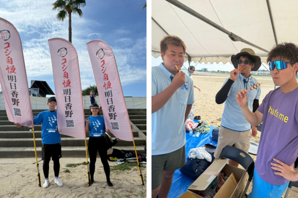 予選リーグ、順位決定戦が行われ、空中での激しいラリーやダイビングなど、ビーチテニスならではのプレーで、選手がたくさんの観客を虜にしました。明日香野は、決勝戦が始まるタイミングで観客の皆様に「大人の団子 みたらし」「もち麦入り黒糖わらび餅」「北海道産小豆の葛まんじゅうと水ようかん」をお渡ししました。