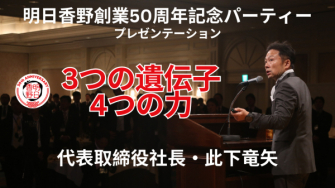 2025年11月7日の「明日香野創業50周年記念パーティー」にて行われた、当社代表取締役社長・此下竜矢によるプレゼンテーションのすべてをご覧いただくことができます。ぜひご視聴ください。