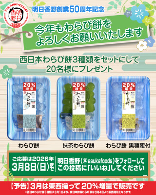 このたび、年間一億粒以上製造している、明日香野の元祖透明「わらび餅」のセットがもらえるキャンペーン「今年もわらび餅をよろしくお願いいたします」を開始しました。キャンペーンの開催期間は2026年2月24日から3月8日までとなります。