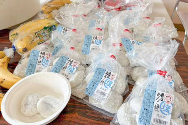 明日香野はレース会場で「塩あんこ餅」を提供。日付をまたいで走り続けるすべての選手の補給食として活用していただきました。